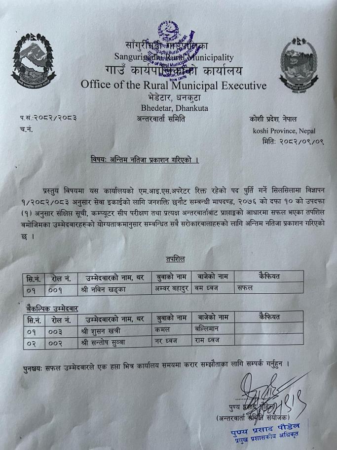 एम.आइ.एस अपरेटर पदपुर्तिको अन्तिम नतिजा प्रकाशन गरिएको ।
