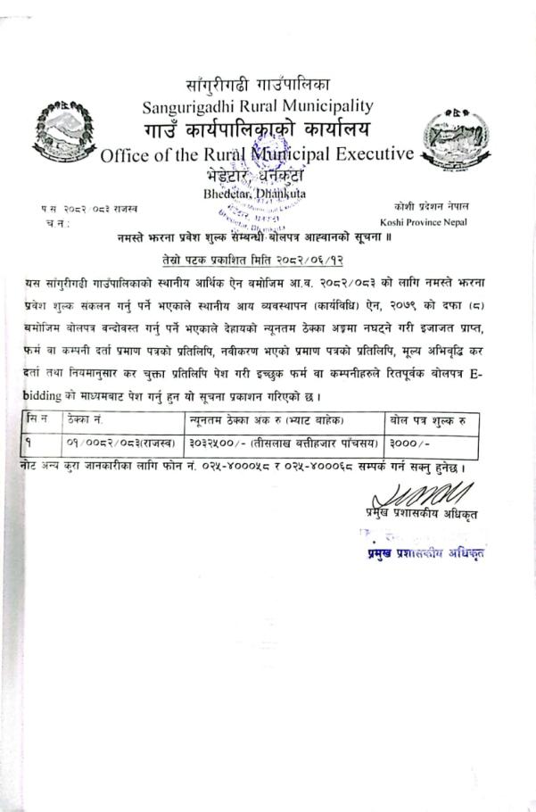 तेस्रो पटक नमस्ते झरना प्रवेश शुल्क सम्बन्धी बोलपत्र आह्वानको सूचना ।