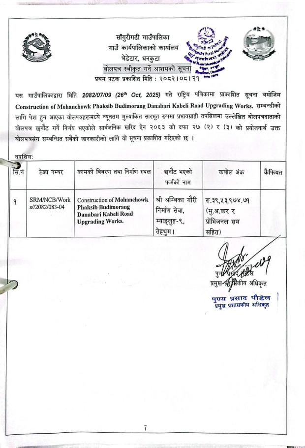 बोलपत्र स्वीकृत गर्ने आशयको सूचना ।