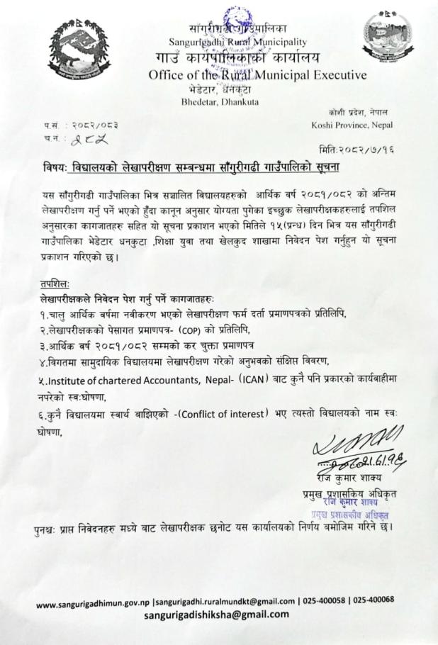 विद्यालयको लेखापरिक्षण सम्बन्धमा साँगुरीगढी गाउँपालिकाको सूचना ।
